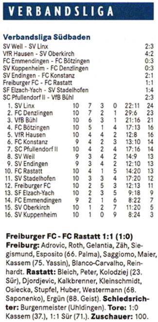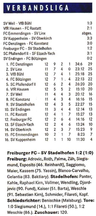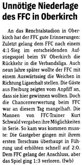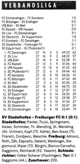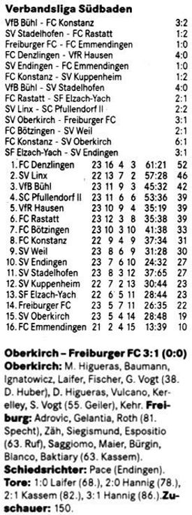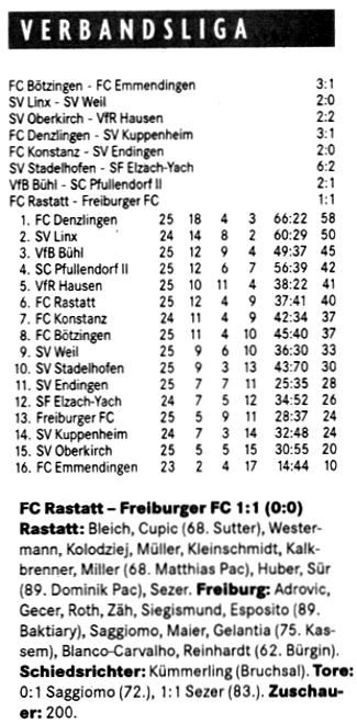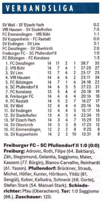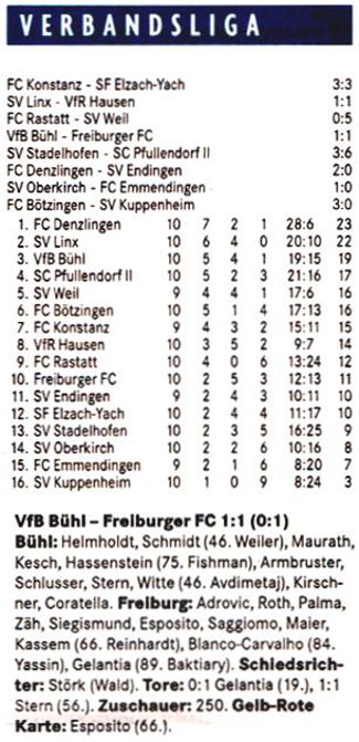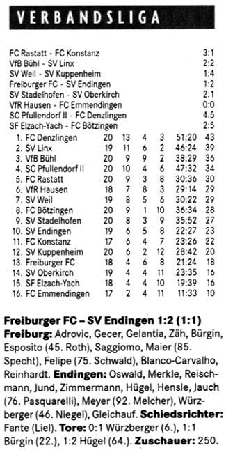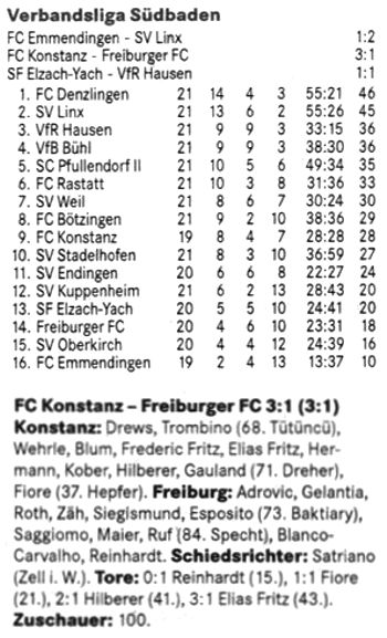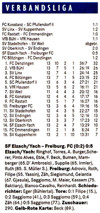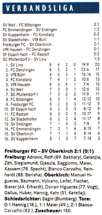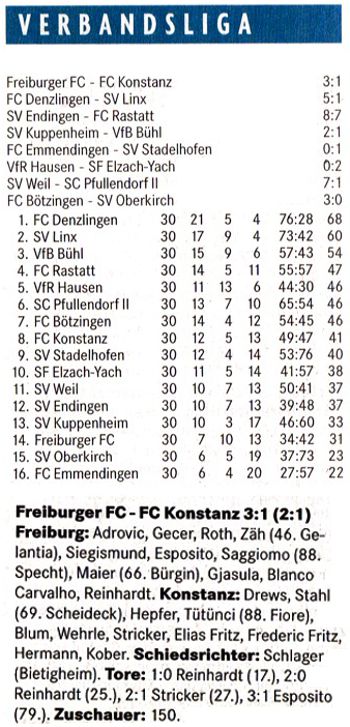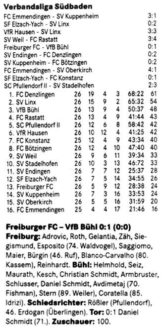 Diese Spielzeit war die Erste, die der Freiburger FC in seiner neuen Heimstätte, dem Dietenbach-Sportpark verbrachte. Nach der langen Ära von Maxi Heidenreich und der Interimsphase mit Richard Dura, wurde zu Beginn dieser Spielzeit mit Kurt Schwald ein neuer Trainer verpflichtet. Sportlich verlief diese Saison durchwachsen. Am Ende stand man auf dem 13. Tabellenplatz, was den Abstieg in die Landesliga nach sich zog. Auch der Trainerwechsel sechs Spieltage vor Saisonschluß, Richard Dura hatte den Job erneut übernommen, konnte den Abstieg nicht mehr verhindern.